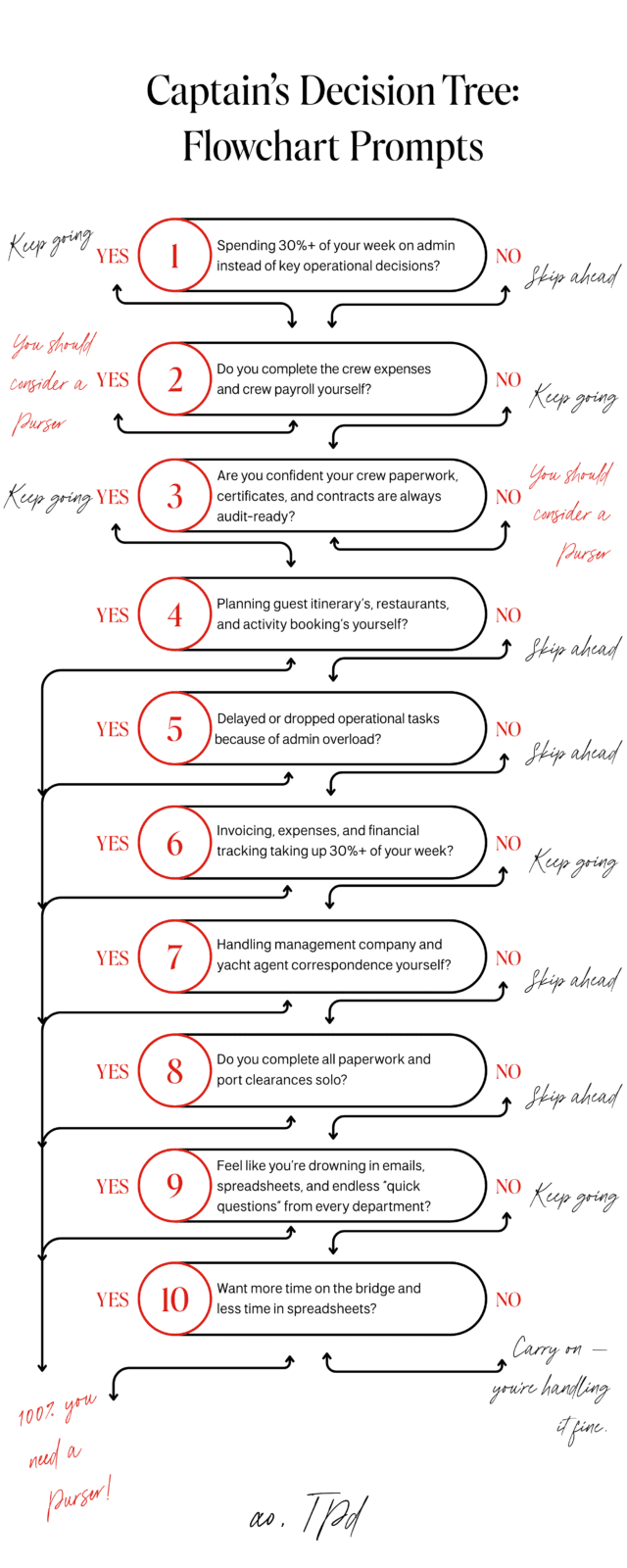 That’s exactly why we put together this Captain’s Decision Tree — a quick way to see whether it’s time to bring in a purser (or at least some shoreside support) to lighten the load.